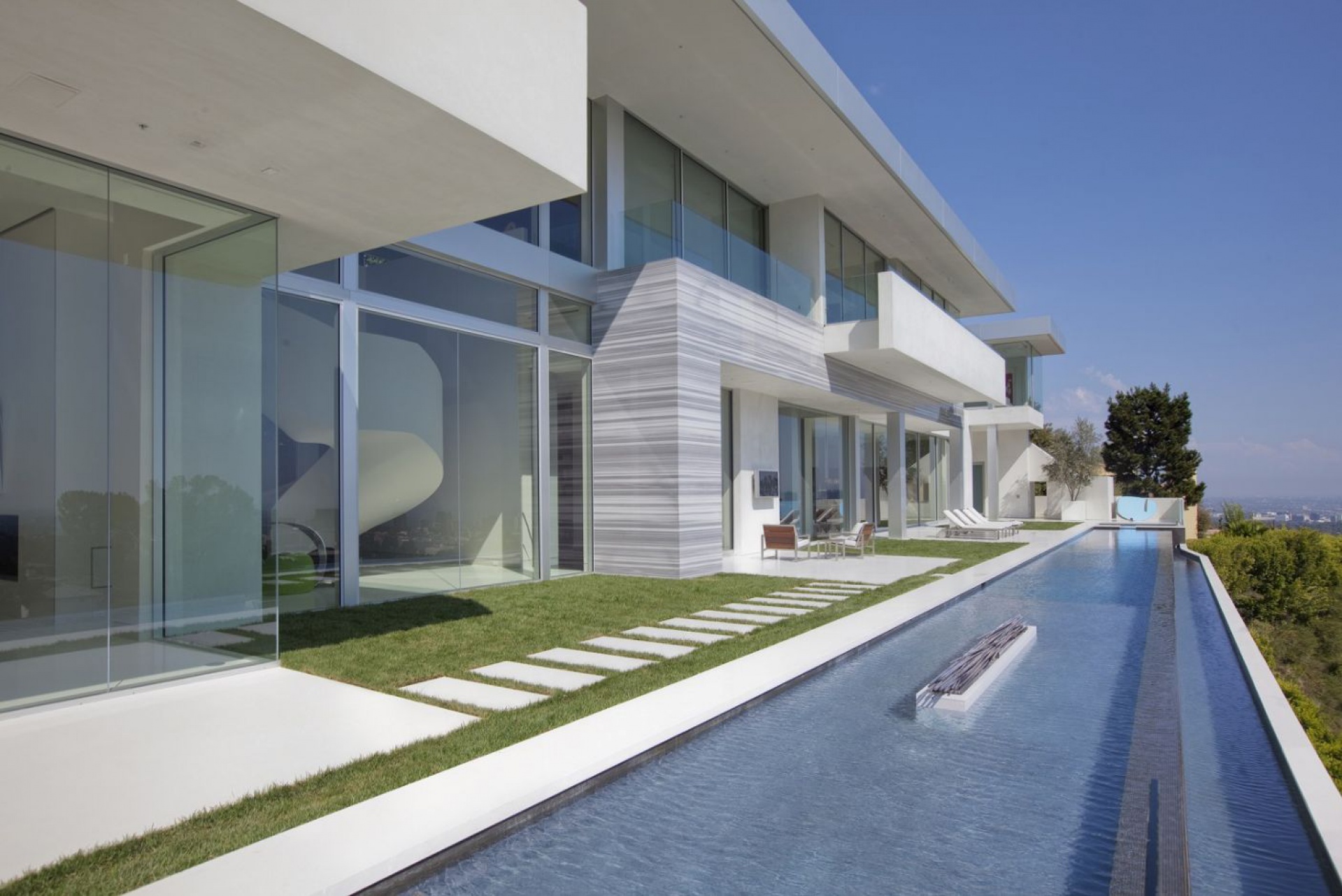 Setting a new precedent for contemporary living, this offering is one of the finest estates available today. With a premier address in lower Bel-Air and peerless amenities that include a vast infinity pool overlooking the entire Los Angeles basin, this 15,000-sqft masterpiece is a showcase of state-of-the-art design and architectural élan. A dramatic entry through 12-ft-high gates leads to a long private driveway and motor court that introduces the residence. Inside, the interiors are replete with 16-ft ceilings and such finishes as book matched marble walls and Italian fixtures. An baronial grand hallway links all of the public rooms, creating superb flow for entertaining. The main floor features an over-sized living room, elegant dining room, screening room, wood-paneled library, wine cellar, and gourmet chef's kitchen. A soaring sculptural staircase climbs to reveal five guest bedrooms, a gym, and luxurious master suite. An attached guest house completes this rare opportunity.